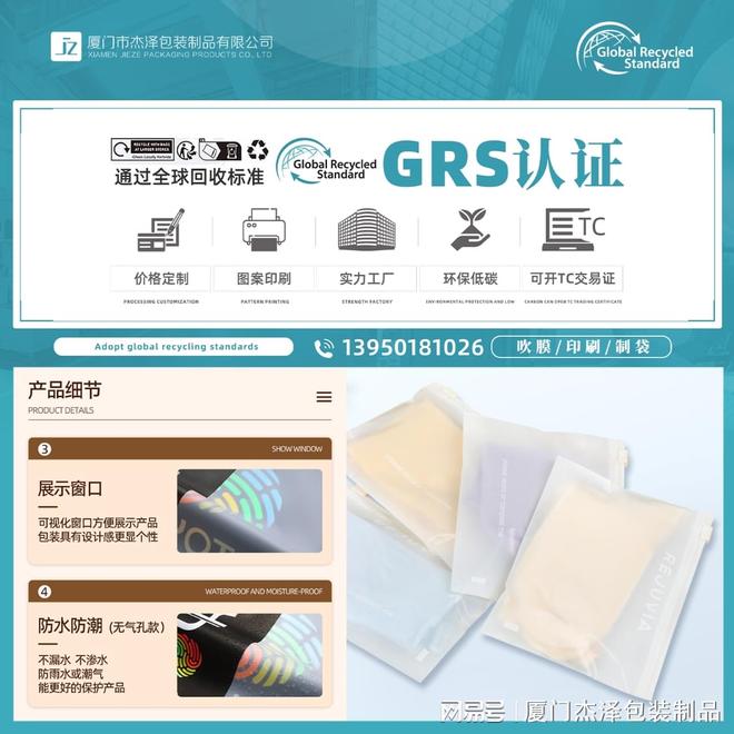还在为出口包装的环保要求头疼?担心塑料税增加成本?厦门杰泽包装推出GRS+EN15343双认证可回收胶袋,一次性解决您的合规难题,让产品顺利进入欧美市场!